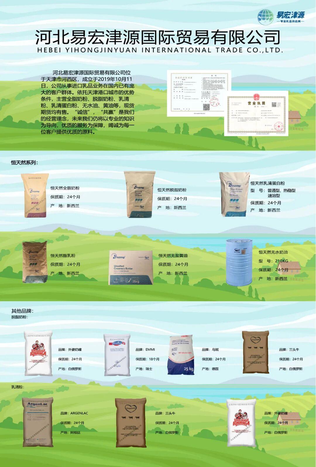 公司简介 COMPANY PROFILE公司凭借高科技含量的产品以市场为导向,整合海内外资源,本着诚信、积极、主动的经营理念,致力于为客户严选全球范围的优质乳粉原料及配料,从而为广大合作商提供优质的全脂、脱脂、乳清等产品,公司产品为各类客户提供优质原料。随着市场格局的不断变化,新商务模式的迭代。公司不断引进国际一流的品牌、高素质的管理人员、高学历的技术和研发团队,提供强大的技术支持和专业的售后服务,以便于给客户解决各类的问题,我们的您的满意就是我们的服务宗旨,我们只做优质奶源的搬运工。主营业务 MAIN BUSINESS全脂奶粉:恒天然/BESTWAY-新西兰、科拿(CONAPROLE)-乌拉圭、外婆奶罐(BABUSHKINA)/贝兰多BELLAKT-白俄罗斯、山河-国产脱脂奶粉:外婆奶罐(BABUSHKINA)/三头牛(SLUTSK)/小绿叶(MILKAVITA)/卡琳卡/百乐客/明斯克1M/明斯克3M/贝兰多BELLAKT/MILIDA/LUNINES-白俄罗斯·恒天然(NZMP)-新西兰羊奶粉:BESTWAY-新西兰乳清粉:白俄D40、D9018维利奥(上海)食品贸易有限公司