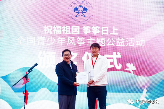 中华全国体育基金会中体联公益基金主任、中国风筝协会名誉主席罗杰为“祝福祖国 筝筝日上”全国青少年风筝主题公益活动获奖单位代表颁奖
