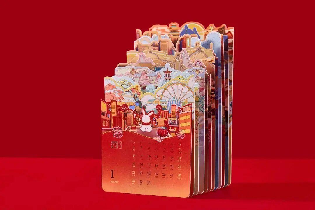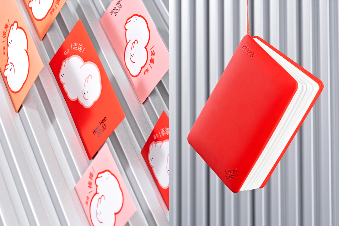 欢聚集团今年的设计,用大面积的红色和银色为核心主调,在产品选择上还是以比较实用的红包、台历等为主,搭配上俏皮可爱的小公仔盲盒,还是很有料的。