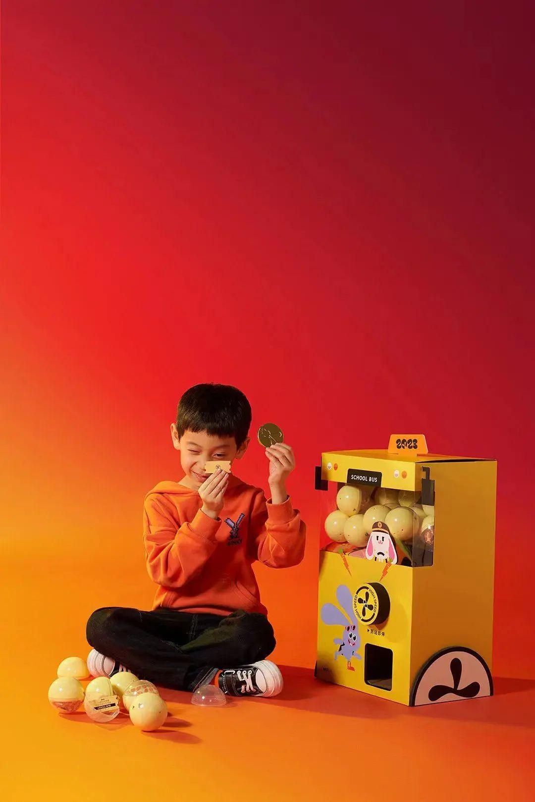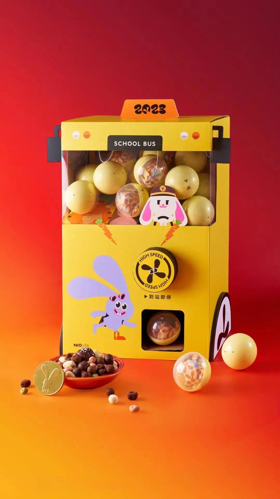 蔚来汽车围绕“兔飞猛进”为主题,在整个礼盒设计上,以扭蛋机为灵感,将各种圆形的零食放进去,小朋友看到应该会超级喜欢。