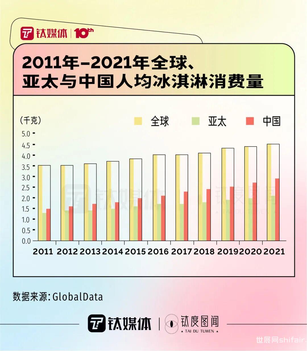 不过,从人均冰淇淋消费量来看,中国冰淇淋市场仍具有较大的上涨空间。据GlobalData数据,2021年,中国人均冰淇淋消费量预计达到2.9kg,与10年前的2011年相比,约增长了1倍。2.9kg的人均冰淇淋消费量,虽高过亚太平均水平(2.1kg),但与全球4.5kg的人均冰淇淋消费量相比,仍有不少差距。