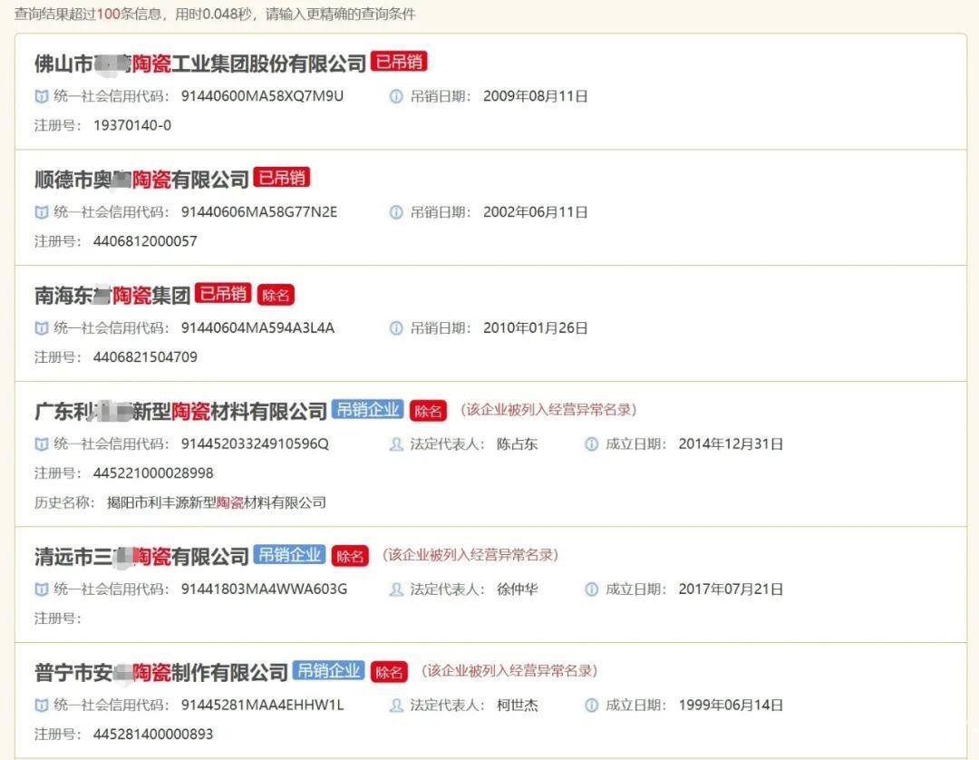 2024年开年至今,陶瓷行业洗牌进一步加剧。随着价格战愈演愈烈,陶企的利润空间也越来越低微,加之生产成本增加,竞争环境变得更是纷乱复杂,一大批实力不足的陶企被逐渐淘汰。中陶君在国家企业信用信息公示系统查询发现,广东省超100家陶企被吊销营业执照。而近一年内,广东依然出现了多家新注册的陶企。
