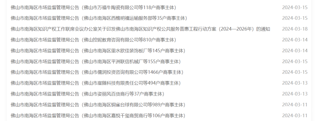 5家佛山陶企被吊销营业执照大量“僵尸企业”被清理近期,佛山市南海区市场监督管理局一连发布多份公告,对6000+“僵尸企业”进行依法清理。公告显示,经过与区税务部门核对数据,南海区市场监管局共梳理出2021年度、2022年度连续两个年度未报年报、未纳税企业7587户,经核查共立案查处6258户,唤醒企业619户,不符合吊销条件710户。截至目前,立案查处的6258户“僵尸企业”均进入吊销处罚决定公告阶段。