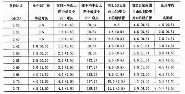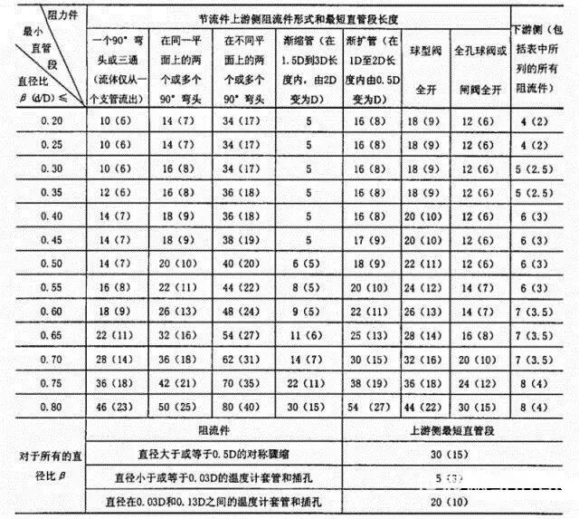 1.节流装置应安装在被测介质完全充满的管道上。2.节流装置的上、下游侧应有一定长度的直管段。上游侧的最小直管段与上游侧的局部阻力件形式和节流孔直径与管道内径的比值 (f l = d/D ) 有关。a)孔板、喷嘴和文丘里喷嘴所要求的上、下游侧最短直管段长度见表4。表4 孔板、喷嘴和文丘里喷嘴所要求最短直管段长度