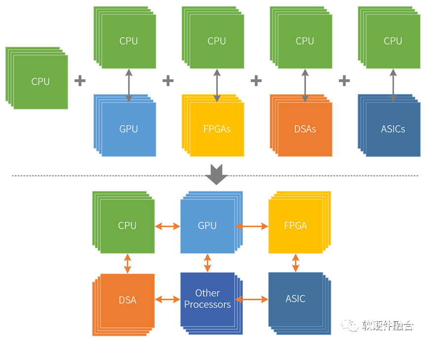 CPU是图灵完备的(在这里,图灵完备可以通俗的理解成可以独立运行的处理器平台),因此CPU可以单独的作为软件系统的运行平台。而GPU等其他加速处理器则不同,这些平台是非图灵完备的,或者说无法独立运行,只能在CPU的协助下才可以运行。也因此,我们通常见到的异构计算系统都是“CPU+xPU加速处理器”的架构(xPU特指其他各类非CPU处理器)。2 异构成为计算架构的主流