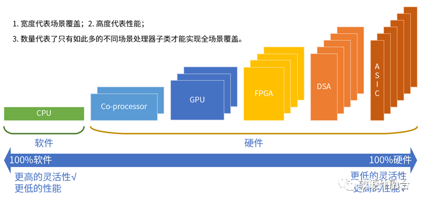 我们依据指令复杂度从简单到复杂,可以把典型的处理器引擎划分为CPU、协处理器、GPU、FPGA、DSA和ASIC。CPU可以理解成纯软件,协处理器是附属于CPU,在硬件上跟CPU是一体的。因此,可以作为加速处理器xPU的处理器引擎类型只有后面四个。异构计算的核心矛盾在于:系统越复杂,越需要选择灵活的处理器;性能挑战越大,越需要选择定制的处理器。本质原因在于,单一处理器无法兼顾性能和灵活性:- GPGPU,通用众核并行计算平台,GPU灵活性较好,适用于性能敏感的业务应用加速;但性能效率不够极致。