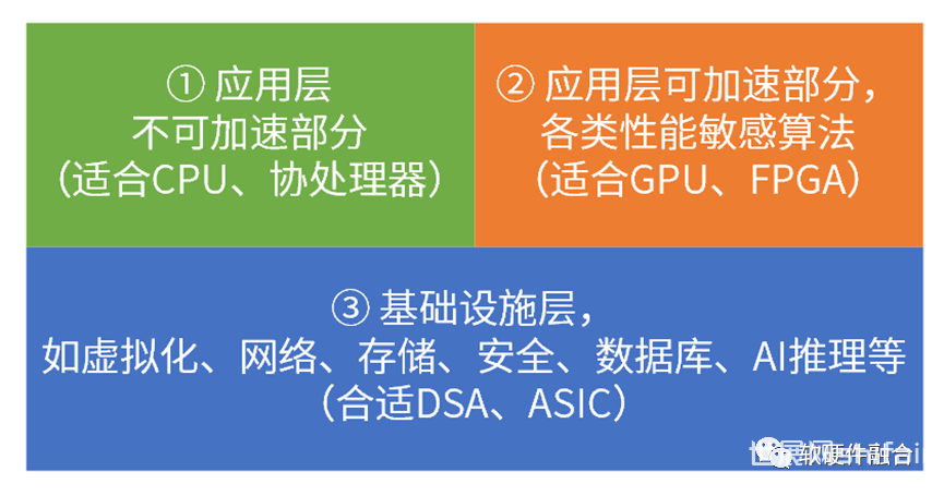 - 另一个极端,即不太好加速的应用部分。在硬件平台上到底会运行什么样的应用,通常是不可预知的,或者说应用是非常不确定的。因此,针对应用,最好是用CPU(+协处理器)平台。CPU平台还有另外一个价值,兜底,凡是无法加速或者不存在合适加速处理器的工作任务都可以放在CPU平台处理。