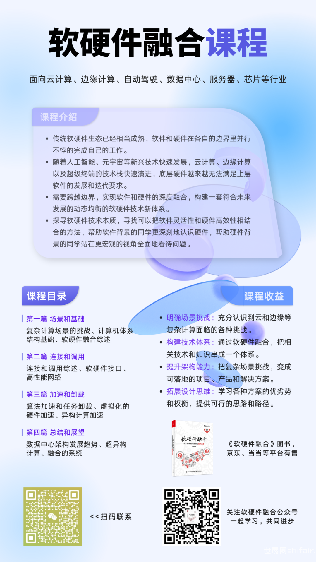 软件越来越复杂,业务逻辑变化越来越快,具体的表现就是软件开发者越来越崇尚敏捷开发,两个月一个小迭代,半年一个大迭代。同样由于系统的复杂度提升,硬件却与软件相反,其开发难度越来越大,开发周期1-3年,生命周期5-8年。硬件的迭代周期完全跟不上软件的更新节奏。因此,需要更进一步的系统架构创新,把传统的软件层次的能力融入到硬件中去。这些能力包括功能的扩展性、资源的弹性和近乎无限的资源扩展、完全的硬件虚拟化、硬件高可用等等,通过这些能力来整体的提升硬件的灵活性。超异构计算,需要“软硬件融合”来驾驭。5.5 小结