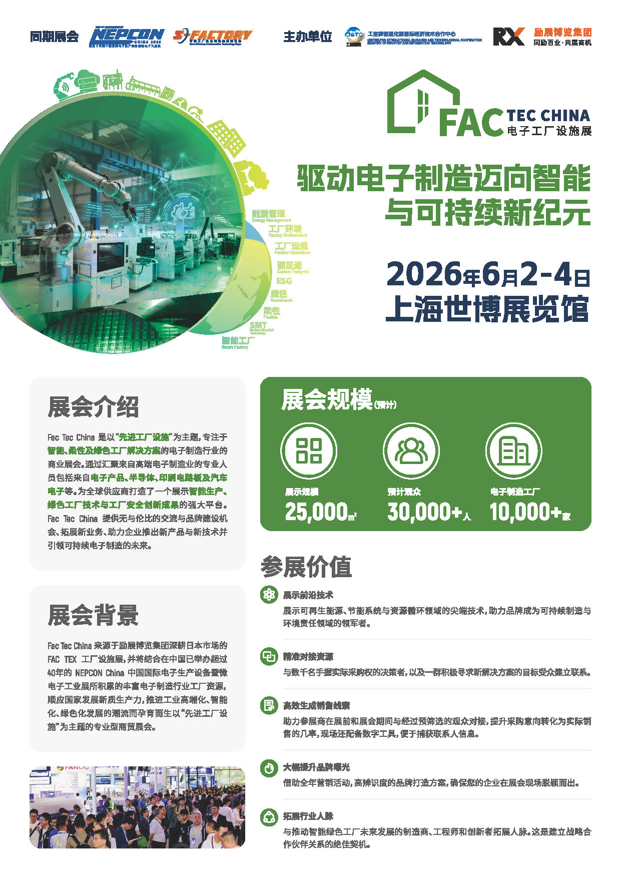 中国(上海)国际电子工厂设施展(FAC TEC CHINA)聚焦“先进工厂设施”这一主题,致力于展示智能、柔性及绿色工厂的解决方案,是电子制造业领域的专业商业盛会。该展会汇聚了来自电子产品、半导体、印刷电路板以及汽车电子等高端电子制造业的专业人士。它为全球供应商搭建了一个展示智能生产、绿色工厂技术以及工厂安全创新成果的强大舞台。FAC TEC CHINA不仅提供了交流与品牌建设的良机,还助力企业拓展新业务,推出新产品与新技术,并引领可持续电子制造的未来趋势。