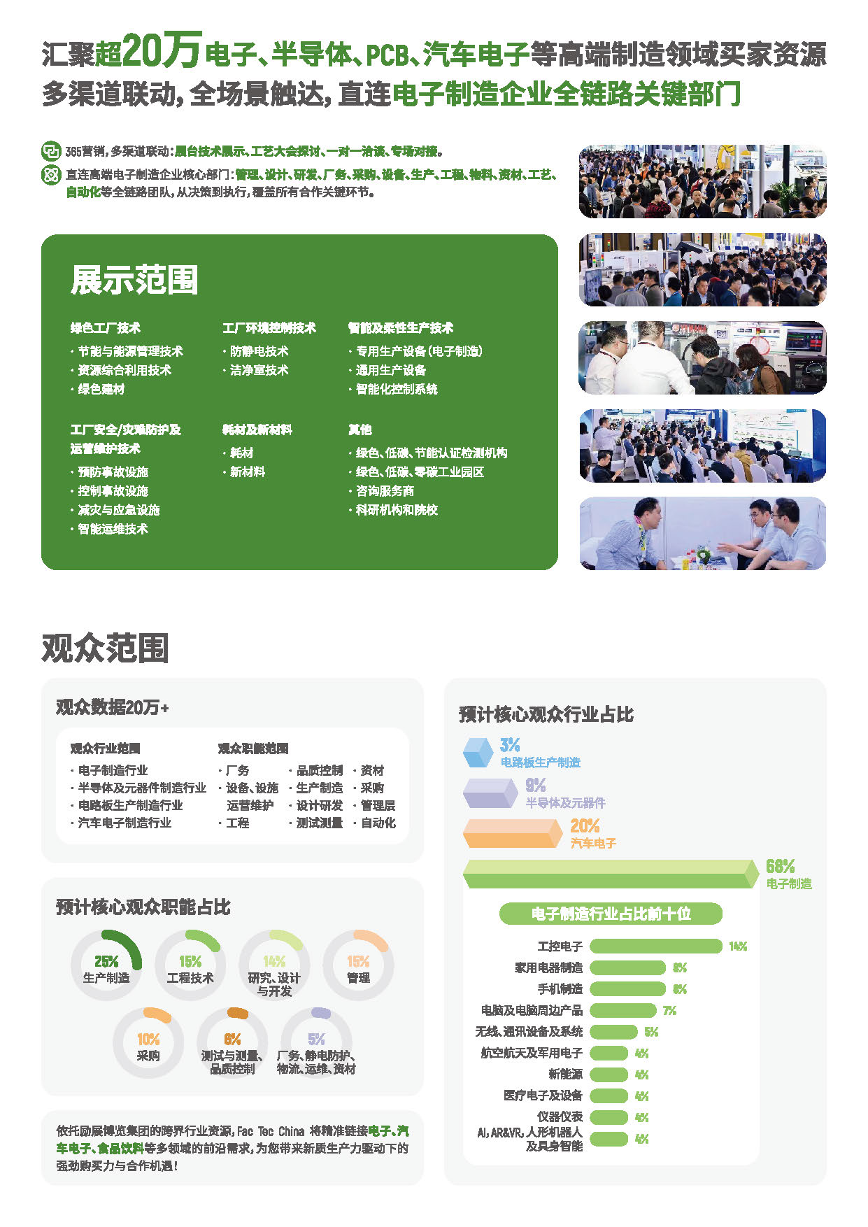 Fac Tec China is the leading trade event dedicated to intelligent, flexible, and green factory solutions for the electronics industry. By convening top-tier manufacturers from sectors like semiconductors, PCBs, and automotive electronics, it creates a powerful platform for global suppliers to showcase innovations in smart production, environmental control, and factory safety. With unmatched networking and brand-building opportunities, Fac Tec China empowers businesses to launch new technologies, expand into emerging markets, and shape the future of sustainable electronics manufacturing.