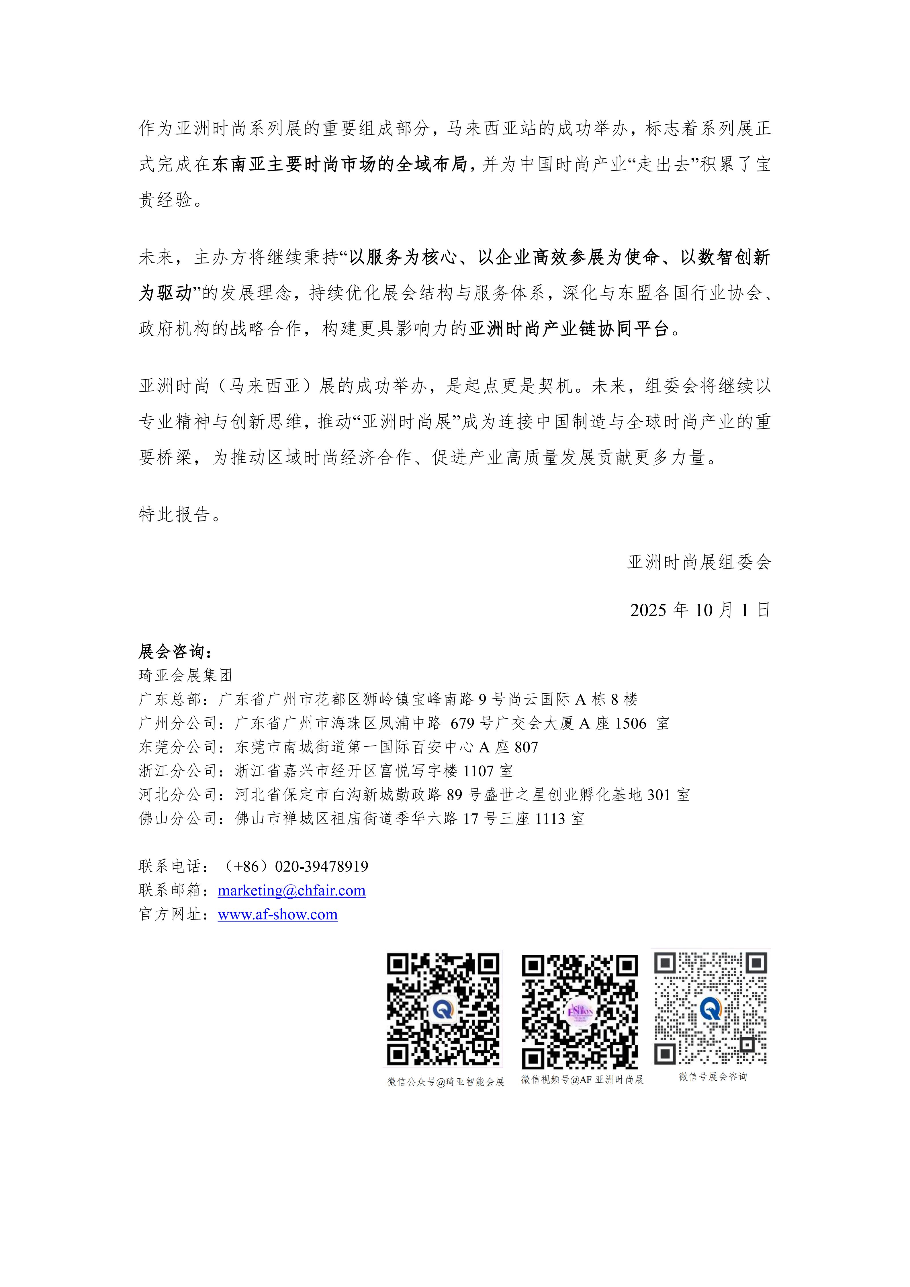 为推动亚洲时尚产业链交流合作,助力亚洲时尚制造品牌拓展东南亚市场,由广东琦亚展览科技有限公司主办的第二届亚洲时尚(马来西亚)展(Asia Fashion Malaysia Show 2025)将于 2026 年 09 月 17 日-09 月 19 日在马来西亚吉隆坡国际贸易与展览中心(MITEC 2–3 馆)隆重举办。