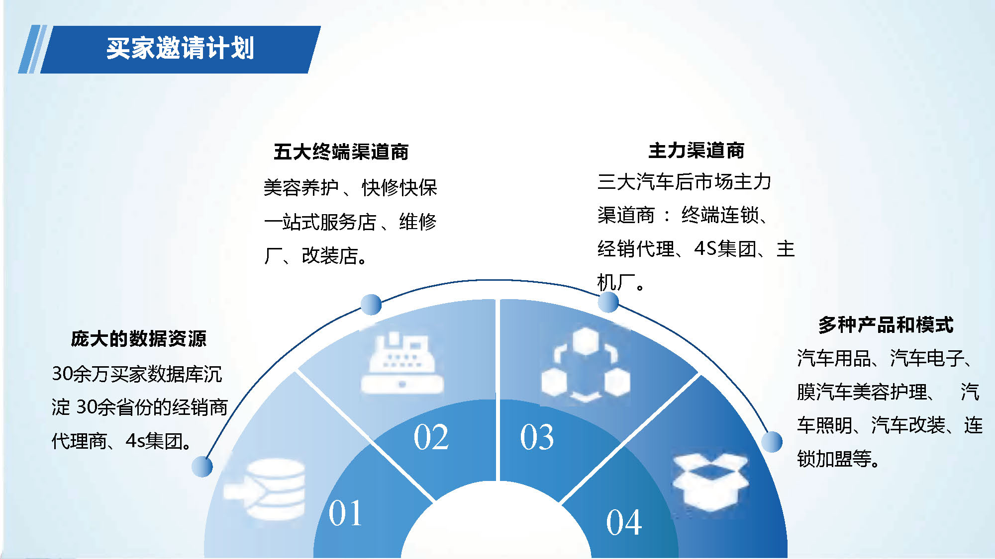 连锁加盟展区:美容养护连锁模式、快修快保连锁模式、汽配城/汽车市场综合体、客户经营管理系统