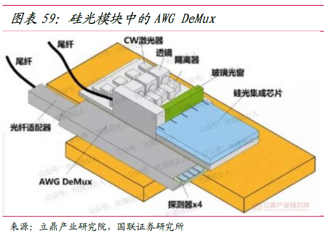 为有效控制 800G 和 1.6T 光模块的成本和功耗,光模块厂商积极采用新架构和新器件。OFC 2023 展会,新易盛和联特科技都推出了采用薄膜铌酸锂(TFLN)调制的 800G 产品,其中新易盛最新的基于薄膜铌酸锂(TFLN)调制器的 800G OSFP DR8 模块搭配集成 TIA 的 5 纳米 DSP 芯片,功耗仅为 11.2W,处于行业领先地位,为 800G 光模块树立了新的标准。根据 LightCounting 预测数据,从 2022 年开始全球 800G 以太网光模块出货量有望超过 15 万片,并在 2023-2025 年快速增长。2023-2025 年 800G 以太网光模块全球市场份额分别达到 4.25/9.87/18.98 亿美元,分别同比增长 133%/132%/92%。AWG 芯片在数据中心市场的竞争优势从 100G 光模块开始,4 通道技术开始普及。单模光纤传输 4×25G 光信号,最早采用的是 PSM4 方案。PSM4 的每个光纤收发器仅需采用一个激光器,分光四路, 分别经四个调制器输出,因此节省了光源成本。但是随着传输距离的增加,光纤成本迅速增加,因此 PSM4 通常应用于传输距离在 500 米以下的场景。对于传输距离大于 500 米的应用场景,为了节约光纤成本,电信网中的 CWDM 技术被引入数据中心,即为 CWDM4 传输方案,通过波分复用/解复用器,在一根光纤中传输 1271nm、1291nm、1311nm、1331nm 四个间隔 20nm 的波长,这样在两个光纤收发模块之间,只需两根光纤就可实现双向传输。CWDM4 可支持 4×25G 信号传输,在 500~2000 米传输距离较 PSM4 方案有成本优势。