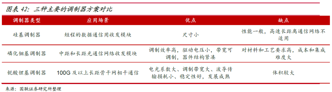 目前行业内的主流电光调制器有三种,其基底分别采用硅、磷化铟和铌酸锂材料, 并且根据其优缺点不同,可适用于不同通信距离的应用场景。