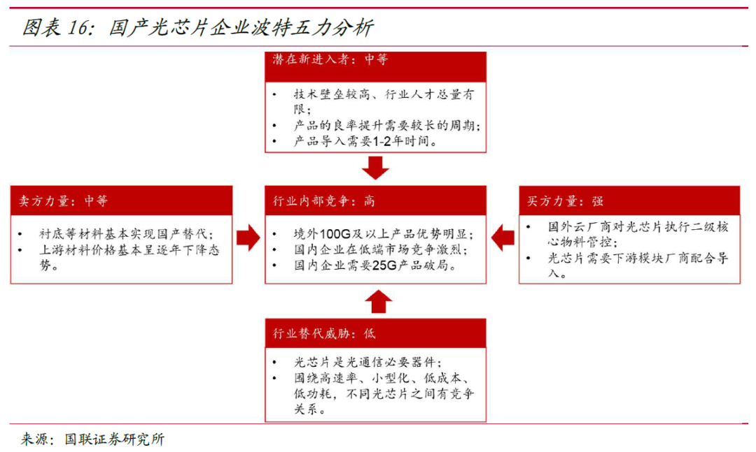 按照产品速率区分,我国光芯片企业已基本掌握 10G 及以下速率光芯片的核心技术,依靠封装优势在中低端市场已形成较强影响力。根据 ICC 预测,2021 年 2.5G 及以下国产光芯片占全球比重超过 90%,10G 光芯片方面国产光芯片占全球比重约 60%, 但不同频段光芯片的国产化情况存在差异,部分 10G 光芯片产品性能要求较高、难度较大,如 10G VCSEL EML 激光器芯片等,国产化率不到 40%。国产光芯片行业同时面临低端产品竞争激烈,高端产品突破困难的国产替代挑战。作为从原材料到光器件的关键环节,光芯片企业还需要上游衬底企业和下游光模块企业的配合,来加快产品性能完善和导入。光芯片行业具有较高的准入门槛。特别是采用 IDM 模式的企业,光芯片产品设计、良率的提升需要较长周期。光芯片导入下游光器件和模块,需要经过性能测试、可靠性测试等过程。