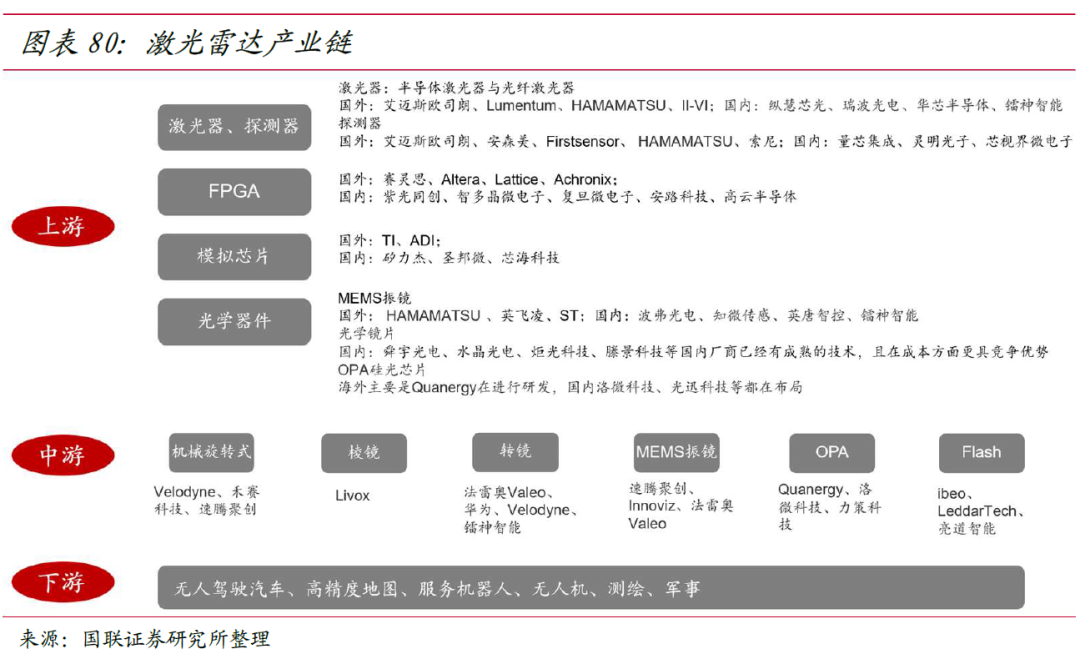 激光雷达产业链上游包括激光器、探测器、芯片、其他结构部件;中游是各种形态的激光雷达,包括机械式激光雷达、半固态激光雷达和固态激光雷达;下游即各大 Tier1 车厂以及整车厂商,主要用于 ADAS 辅助驾驶系统以及高级自动驾驶。