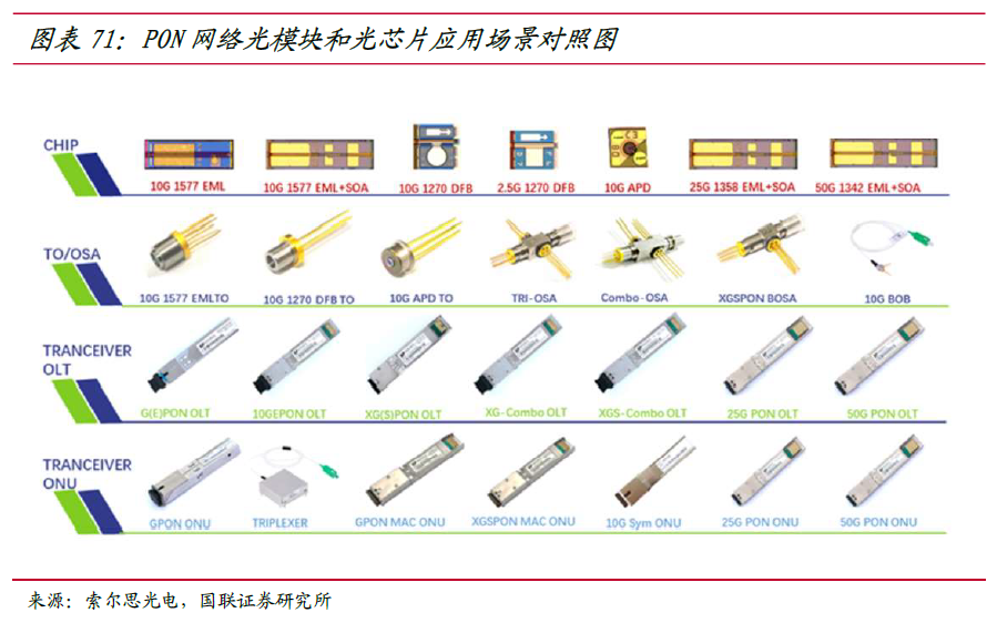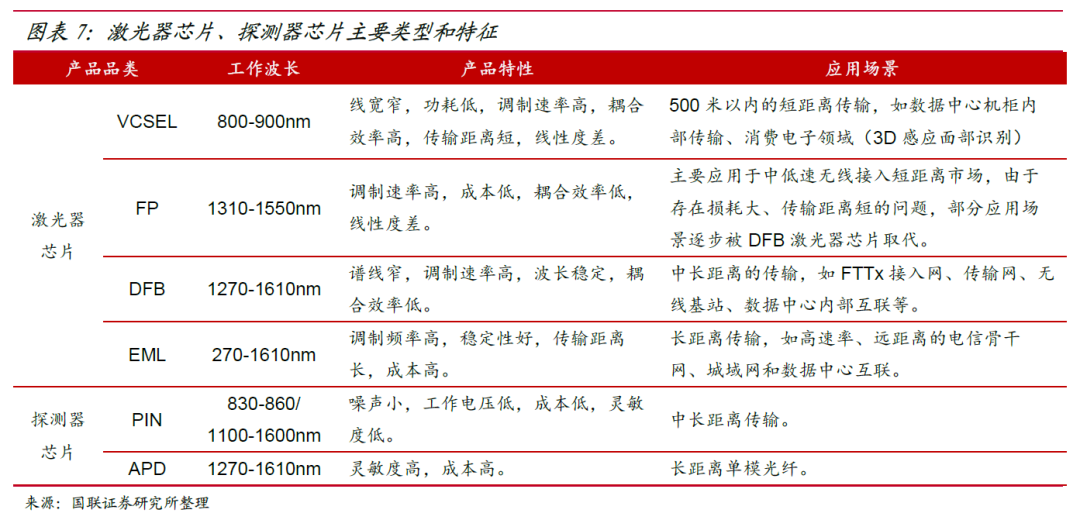 激光器芯片和探测器芯片,根据调制速率、功耗、传输距离、成本等关键特性的不同,分别应用于无线回传、FTTX 接入网、数据中心、长途传输等光通信场景中。