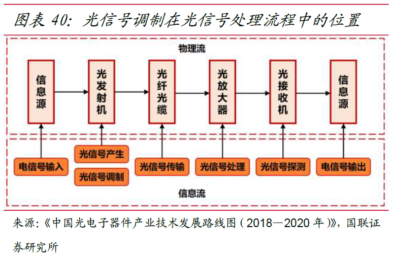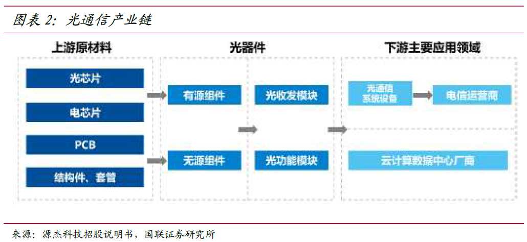 光通信系统是以光信号为信息载体,以光纤作为传输介质,通过电光转换,以光 信号传输信息的系统。按照在信息流中位置,光通信器件主要功能包括:光信号产生、光信号调制、光信号传输、光信号处理、光信号探测。从产业链角度看,光芯片、电芯片、PCB、其他结构件构成光通信产业上游;产业中游为光器件,包括光组件与光模块;产业下游组装成系统设备,最终应用于电信市场,如光纤接入、4G/5G 移动通信网络,云计算、互联网厂商数据中心等领域。