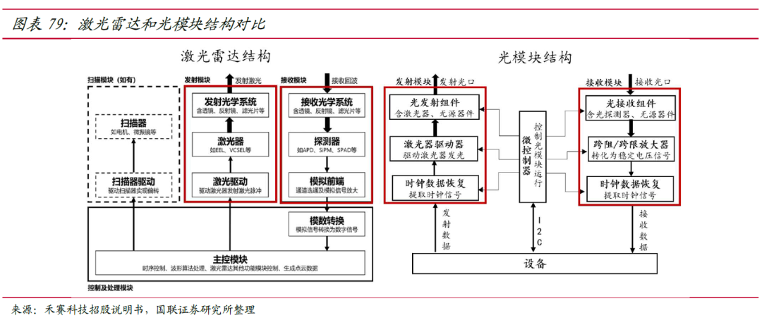 根据源杰科技招股说明书,10G PON 下行 1577 EML 光芯片,由于需要提供更大的传输功率、更远的传输距离、更小的信号噪声,使得光信号传输质量更高,相关芯片设计与工艺开发复杂,国产化率低,仅博通、住友电工、三菱电机等国际少数头部厂商能够批量供货,国内光芯片厂商中海信宽带等可以部分实现自产自用。根据 ICC 预测,2019-2024 年,中国光芯片厂商销售规模占全球光芯片市场的比例将不断提升,且产品结构不断升级。10G、25G 及以上光芯片有较大的提升空间。25G 及以上光芯片方面,随着 5G 建设推进,我国光芯片厂商在应用于 5G 基站前传光模块的 25G DFB 激光器芯片有所突破,数据中心市场光模块企业开始逐步使用国产厂商的 25G DFB 激光器芯片,2021 年 25G 光芯片的国产化率约 20%,但 25G 及以上光芯片的国产化率仍较低约 5%,目前仍以海外光芯片厂商为主。目前国内光芯片企业积极开发 25G 光芯片产品,源杰科技、光迅科技、仕佳光子、海信宽带等企业都有相关业务布局。其中源杰科技在其招股说明书中指出,公司 的 25G CWDM 4/LWDM 4 波段 DFB 激光器芯片,基本优于或达到同行业先进竞品 水平,能够满足下游客户的需求。25G 是数通市场破局抓手,50GEML 是未来市场份额提升关键。因为 400G 和 800G 光模块相继进入规模部署期,50G PAM EML 广泛用于单通道 100G 的 100G/200G/400G 光模块,目前主流的 800G 光模块也采用了 8×100G 的架构。由于铌酸锂市场空间有限且进入壁垒高,目前主要有日本富士通、住友,我国光库科技等铌酸锂调制器厂商。其中,富士通 2020 年占据传统铌酸锂约70%的全球市场份额。根据《2018-2022 国家光电子产业路线图》到 2022 年铌酸锂芯片和调制器市场占有率超过 30%。目前上游铌酸锂薄膜材料已经由济南晶正突破并掌握全球主要供应份额,国内薄膜铌酸锂产业链已趋于成熟。我国薄膜铌酸锂领域国内已达领先水平,形成完整的产业链布局。2022 年光库科技已经发布了两款相干调制器和两款强度调制器产品。OFC2023 光库科技展示了两款产品:C+L 70GHz 强度调制器(AM70)和薄膜铌酸锂强度调制器结合了超高的带宽(> 70 GHz)和小体积的特点,可以满足模拟信号光纤传输应用中不断增长的带宽需求,提供更合适的解决方案。可提供定制化服务。C+L 波段 96 GBaud 高带宽相干驱动调制器(HB-CDM-96G)产品具有超高的带宽 (> 70 GHz) 和更小的体积,能使用在高达 96 GBaud 波特率相干传输中的不同调制码型(如 DP-QPSK, DP-16QAM 和 DP-64QAM 等)。横向拓展,积极开拓激光雷达第二曲线激光雷达是光器件行业进行横向拓展的重要方向。激光雷达主要由发射模块、接收模块、扫描模块、信号控制及处理(主控)模块四个部分构成。其中,硬件电子模块占激光雷达的 BOM 成本最大,约为 50%-60%,主要包括发射器和接收器,是实现光电转换的重要基础。同样,光发射组件与光接收组件也是光模块进行光电转换的重要部分。另外,光学模块和结构模块分别占激光雷达总成本的 10%-15%和 25%。