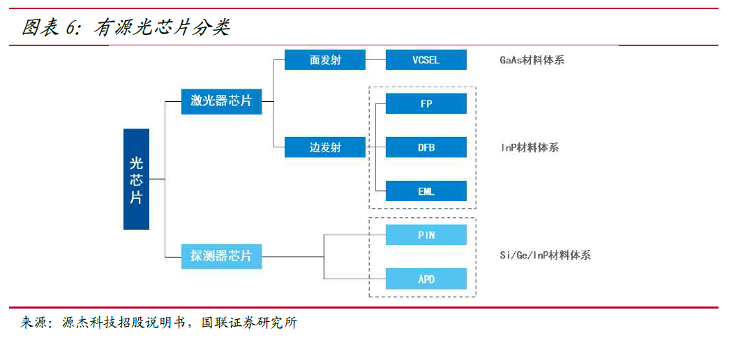 激光器芯片和探测器芯片是最主要的有源光芯片,其中激光器芯片主要用于发射信号,将电信号转化为光信号,探测器芯片主要用于接收信号,将光信号转化为电信号。激光器芯片,按出光结构可进一步分为面发射芯片和边发射芯片,面发射芯片包括 VCSEL 芯片,边发射芯片包括 FP、DFB 和 EML 芯片;探测器芯片主要有 PIN 和 APD 两类。