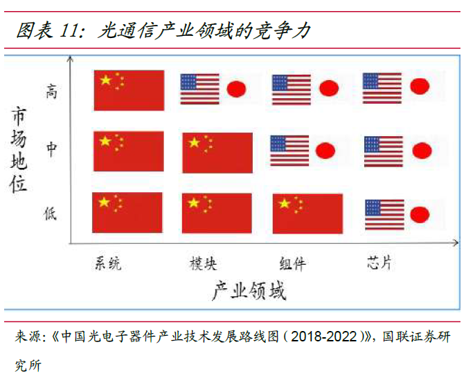 光芯片企业采用 IDM 模式提高竞争力光芯片生产工艺和流程均较为复杂,包括芯片设计、基板制造、磊晶成长、晶粒制造、封装测试共五个主要环节。芯片设计指根据芯片功能需求制作光电线路图,这是光芯片生产流程的核心环节。我国多数企业主要集中在这一环,拥有设计能力但不具备生产能力。基板制造/衬底:主要指 InP/GaAs 等材料经提纯、拉晶、切割、抛光、研磨制成单晶体衬底(基板),这是光芯片规模制造的第一个重要环节;磊晶生长/外延片:根据设计需求,生产企业用基板和有机金属气体在 MOCVD/MBE 设备里长晶,制成外延片。外延片是决定光芯片性能的关键一环,生成条件较为严苛, 是光芯片行业技术壁垒最高环节;晶粒制造和封装测试:对外延片进行光刻等系列处理,最后封装成拥有完整光电性能的光芯片。IDM 模式能及时响应各类市场需求,灵活调整产品设计、生产环节的工艺参数及产线的生产计划;能高效排查问题原因,精准指向产品设计、生产工序或测试环节等问题点;还能有效保护产品设计结构与工艺制程的知识产权。国内光芯片企业通过 IDM 模式,可以在响应速度和成本方面取得竞争优势。从源杰科技 IPO 材料披露的产品价格看,国产光芯片可以通过价格优势提升市场份额,并且能在产品成熟期保持价格稳定。国产光芯片产品竞争力不断提升我国光通信企业从下游到中游,已经初步建立全球领先的竞争力,下游的华为、 中兴、烽火等设备企业的传输设备是产率全球领先。在中游的光模块领域,根据 LightCounting 数据,2021 年中国光模块供应商在全球市场的占有率超过 50%。上游的光芯片是光器件的核心元件,美国和日本企业依然占据全球光器件行业市场领先地位,高端芯片进口依赖度高。继光模块产业之后,光芯片是我国光电子领域国产化水平亟待提升的重点环节。