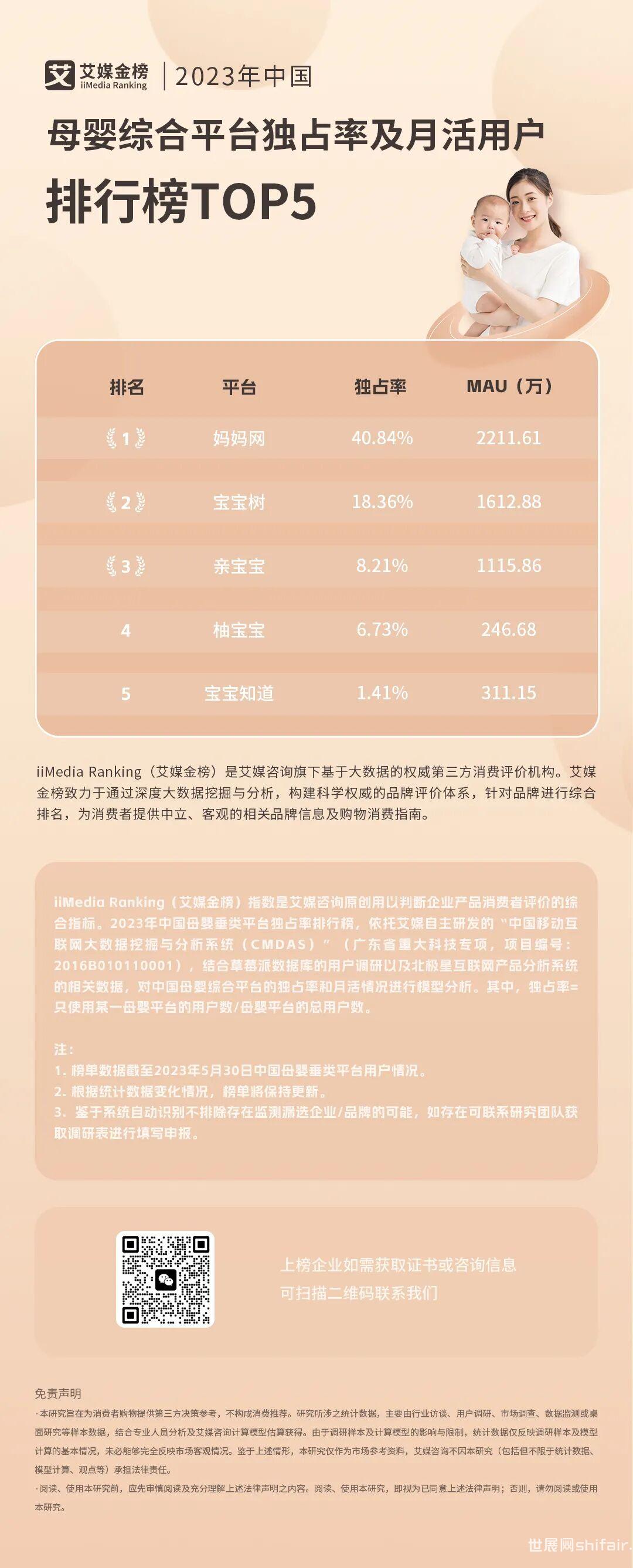 在鼓励生育的政策驱动和优质育儿的市场需求升级共同作用下,母婴消费行业市场规模不断扩大。iiMedia Research(艾媒咨询)数据显示,2022年中国母婴消费市场规模接近6万亿元(57507亿元)。iiMedia Ranking(艾媒金榜)最新发布的《2023年中国母婴综合平台独占率及月活用户排行榜TOP5》,依托艾媒自主研发的“中国移动互联网大数据挖掘与分析系统(CMDAS)”(广东省重大科技专项,项目编号:2016B010110001),结合草莓派数据库的用户调研以及北极星互联网产品分析系统的相关数据,对中国母婴平台的独占率和月活用户进行进行模型分析。月活用户(MAU)能够反应平台的用户体量。从月活用户数据看,2023年1-5月,母婴综合平台中平均月活用户最高三个分别是妈妈网(2211.61万)、宝宝树(1612.88万)和亲宝宝(1115.86万)。调研数据显示,用户对母婴综合平台的需求愈发多元,在各类需求中,母婴用户的高频使用需求主要集中为:获取孕育科学知识、刚需孕育小工具使用以及孕育经验交流。妈妈网具有专业的母婴功能及科学的孕育知识,可以辅助妈妈群体进行科学有效的决策,有效提升用户留存。独占率能够在一定程度反映出平台用户的忠诚度。从独占率来看,母婴综合平台中独占率最高的妈妈网,独占率达到40.84%;其次为宝宝树,独占率为18.36%;第三是亲宝宝,独占率为8.21%。调研数据显示,母婴综合平台的用户使用时长相对较久,有超过53.5%的用户使用母婴类平台已超过半年。