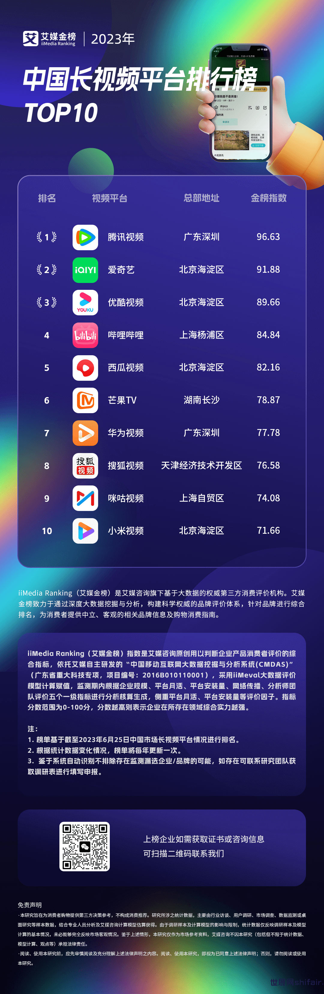 随着移动互联网技术以及智能终端的不断发展,中国网络视频用户规模不断扩大。中国互联网络信息中心(CNNIC)数据显示,截至2022年6月,网络视频(包含短视频)的用户规模为9.95亿人,占整体网民的94.6%。从增长率上看,2016年12月至2022年6月,网络视频(包含短视频)的用户规模增长率最高曾达到24.02%。 网络视频行业,是指在互联网上提供免费或有偿视频流播放、下载服务的行业。按视频平台主攻的重点不同,网络视频可细分为长视频平台、短视频平台等。近年来,随着视频平台内容的不断丰富,越来越多的观众倾向于通过网络视频平台观看视频。 iiMedia Ranking(艾媒金榜)最新发布《2023年中国长视频平台排行榜TOP10》,此榜单依托艾媒自主研发的“中国移动互联网大数据挖掘与分析系统(CMDAS)”(广东省重大科技专项,项目编号:2016B010110001),采用iiMeval大数据评价模型计算赋值,监测期内根据企业规模、平台月活、平台安装量、网络传播、分析师团队评价五个一级指标进行分析核算生成,侧重平台月活、平台安装量等评价因子。指标分数范围为0-100分,分数越高则表示企业在所存在领域综合实力越强。 本次上榜的十大视频平台依次是:腾讯视频(96.63)、爱奇艺(91.88)、优酷视频(89.66)、哔哩哔哩(84.84)、西瓜视频(82.16)、芒果TV(78.87)、华为视频(77.78)、搜狐视频(76.58)、咪咕视频(74.08)、小米视频(71.66)。前三强依旧是腾讯视频、爱奇艺、优酷视频领跑,哔哩哔哩位列第四名,西瓜视频进入榜单第五名。