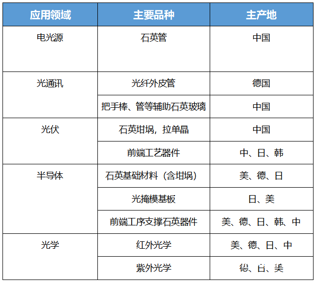 高纯石英制品主要品种及产地赵维佳.我国高纯石英产业现状及资源保障分析在半导体领域,半导体石英制品种类繁多,主要有用于硅片制造单晶的石英坩埚、硅片承载器具、光掩模基板的基板材料等,是半导体生产过程中的关键辅助材料。单晶生长需要用到石英坩埚和石英器件,晶圆加工部分刻蚀、扩散、氧化、退火等步骤中需要用到大量的辅材石英玻璃,如石英片、石英环、石英舟等高纯度石英制品。在光伏行业,石英坩埚是光伏行业不可或缺的重要支撑材料,是硅材料生产重要的配套关键性耗材,可支持太阳能用户在高温条件下连续拉制大直径单晶硅,用于盛装熔融硅并制成后续工序所需晶棒。在光纤通信领域,高纯石英玻璃产品是光纤生产过程中的重要材料,广泛应用于光纤预制棒制成和光纤拉丝工艺中。在光学和光源领域,电光源石英制品可用于生产紫外管、高纯石英管、透明管灯,广泛运用于照明及特种光源行业。高纯石英玻璃用于生产望远镜透镜和实验室光学设备、通信设备、衍射透镜、投影显示器、扫描设备和打印机的光学、激光、以及照相机和超平面电视屏幕、火焰控制设备等。目前,国际上的高纯石英制品企业主要有东曹、贺利氏、Covalent、信越、昆希等,其中半导体石英坩埚主要被贺利氏、信越、迈图等企业垄断。中国主要高纯石英制品生产商有石英股份、菲利华、凯德石英等。参考来源:汪灵.高纯石英的概念及其原料品级划分汪灵.石英的矿床工业类型与应用特点王九一.全球高纯石英原料矿的资源分布与开发现状王自国.我国高纯石英战略布局思考颜玲亚等.中国高纯石英资源开发利用现状及供需形势张艳红等.高纯石英的发展现状、消费及市场预测杨晓勇.高纯石英的研究进展及发展趋势马超等.高纯石英原料矿物学特征与加工技术进展赵维佳.我国高纯石英产业现状及资源保障分析李光惠等.高纯石英原料作为战略性矿产的分析及建议