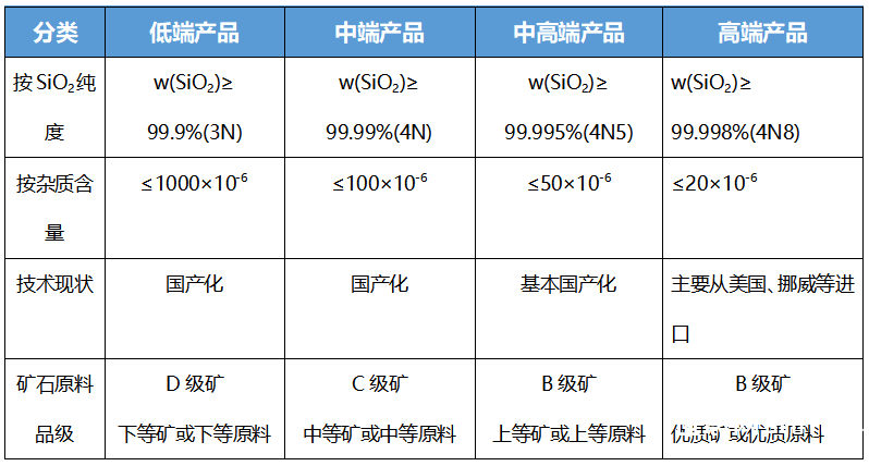 来源:石英股份官网高纯石英是天然石英原料经过一定的加工提纯以后所获得的产品。目前,关于高纯石英的概念没有统一的划分标准。张佩聪等将高纯石英定义为石英晶格中铝-硅异价有限类质同象替代形成的铝晶格,占位杂质含量(晶格Al)≤30μg/g,此时其他杂质(Ti、K、Na、Ca、Mg、Fe等)综合≤20μg/g的天然矿物,对应的石英w(SiO2)纯度≥99.99%(4N)。挪威地质调查局提出了高纯石英中杂质总含量小于50×10-6的前提下,Al含量应小于30×10-6,Ti含量小于10×10-6,Na和K含量均小于8×10-6,Li、Ca含量均小于5×10-6,Fe含量小于3×10-6,P含量小于2×10-6,B含量小于1×10-6。汪灵等提出高纯石英的一般概念为w(SiO2)≥3~5N、w(Fe2O3)小于10×10-6的石英。按SiO2纯度高纯石英产品划分4个等级:低端w(SiO2)≥99.9%(3N),中端w(SiO2)≥99.99%(4N),中高端w(SiO2)≥99.995%(4N5),高端w(SiO2)≥99.998%(4N8)。按产品中Al、B、Li、K、Na、Ca、Mg、Ti、Fe、Mn、Cu、Cr、Ni等杂质元素总量划分:低端产品≤1000×10-6;中端产品≤100×10-6;中高端产品≤50×10-6;高端产品≤20×10-6。