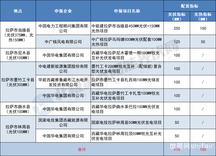拉萨市竞配项目总规模1125MW,其中光伏975MW、光热150MW。追溯集团公司,中国能建、华电、中广核、中国电建、华能、国家电投6家企业成功入选,其中,中国能建以350MW位居第一。
