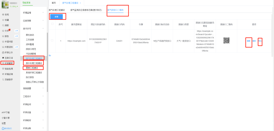 - 2. 如下图,依次点击左菜单环保管家、排污许可、废气处理工程建设、废气排放口二维码、编辑、提交就可以生成,也可以导出、打印。