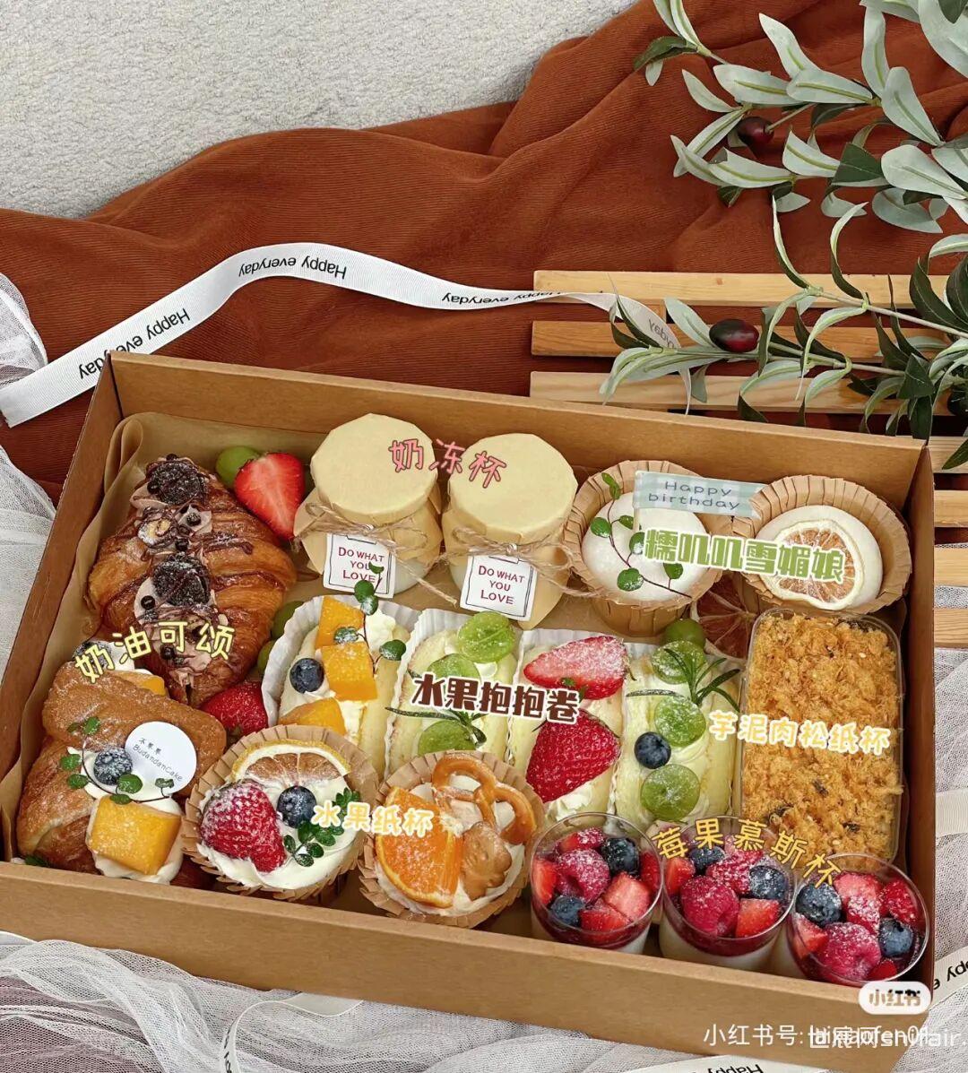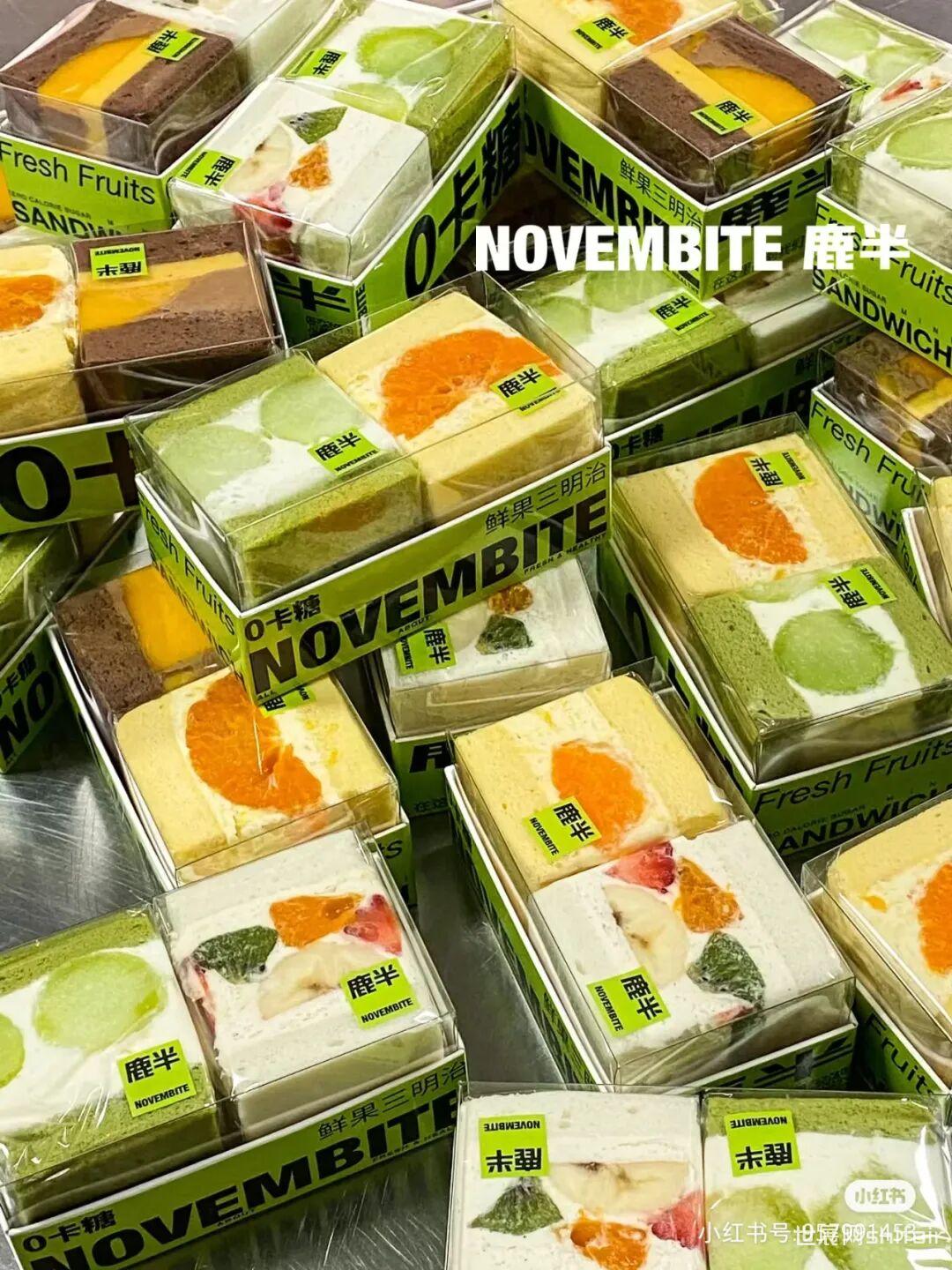 (小红书@不单单烘焙)轻食上线,利用可颂、吐司、贝果等,制成咸味三明治,满足正餐需求。甜食上线,小分量的司康、饼干、泡芙、布丁杯、蛋糕卷,满足零食需求。核心点在于分量少、轻盈爽口、颜值高。像这款水果三明治,对比一般的三明治个头会更小。