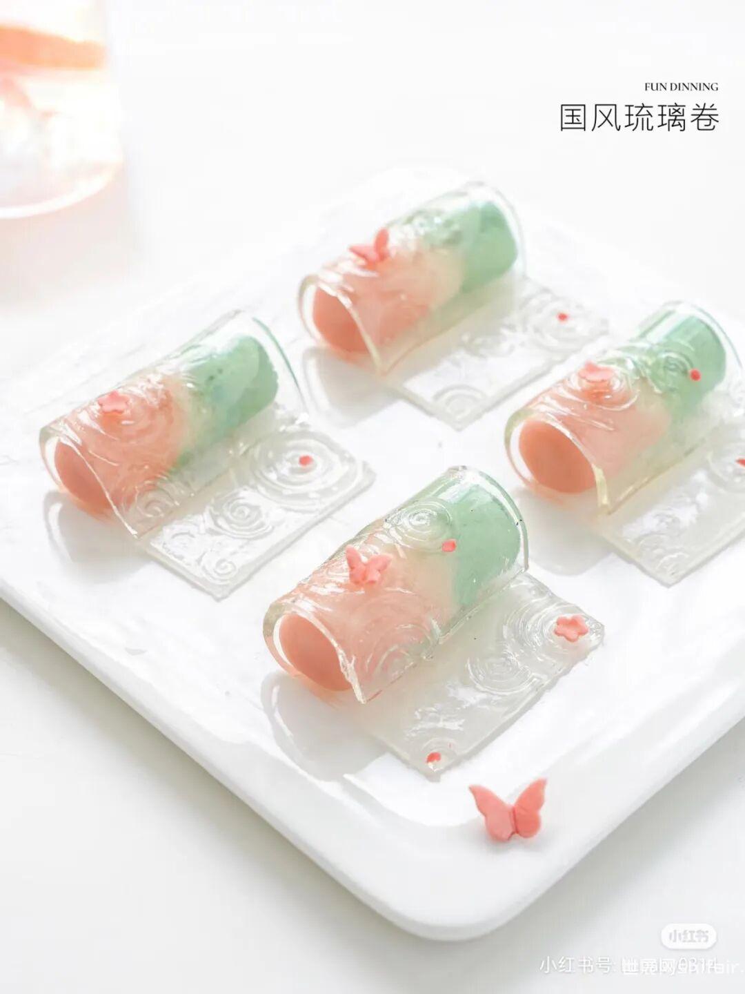 (小红书@小白小磊小天才)外观呈现上,可以巧用凝固剂制出透明果冻质地。整体清透的风格,似是穿透炎热形成了针对夏日而言的视觉降温。不论是作为主体设计还是局部装饰,都能窥见夏日浪漫。