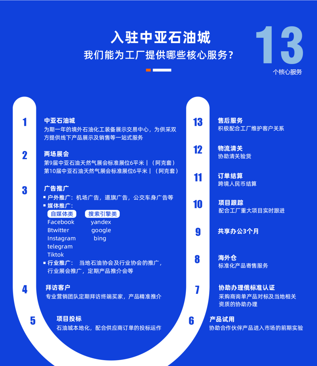 中亚石油城为入驻企业提供13项核心服务,按照各自所长分工合作,石油城主要负责销售和售后,厂家主要负责技术和生产。对于工厂来说,省却了自己开发、推广、销售的时间和成本,发展海外市场的效率自然大大提高!