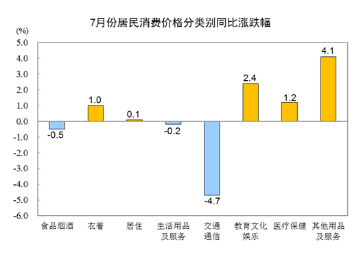 一、各类商品及服务价格同比变动情况7月份,食品烟酒类价格同比下降0.5%,影响CPI(居民消费价格指数)下降约0.14个百分点。食品中,畜肉类价格下降14.0%,影响CPI下降约0.48个百分点,其中猪肉价格下降26.0%,影响CPI下降约0.41个百分点;鲜菜价格下降1.5%,影响CPI下降约0.03个百分点;鲜果价格上涨5.0%,影响CPI上涨约0.10个百分点;水产品价格上涨0.4%,影响CPI上涨约0.01个百分点;粮食价格上涨0.3%,影响CPI上涨约0.01个百分点。其他七大类价格同比五涨两降。其中,其他用品及服务、教育文化娱乐、医疗保健价格分别上涨4.1%、2.4%和1.2%,衣着、居住价格分别上涨1.0%和0.1%;交通通信、生活用品及服务价格分别下降4.7%和0.2%。