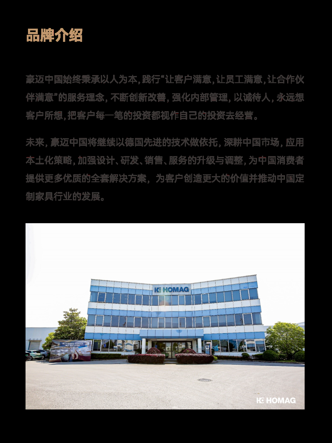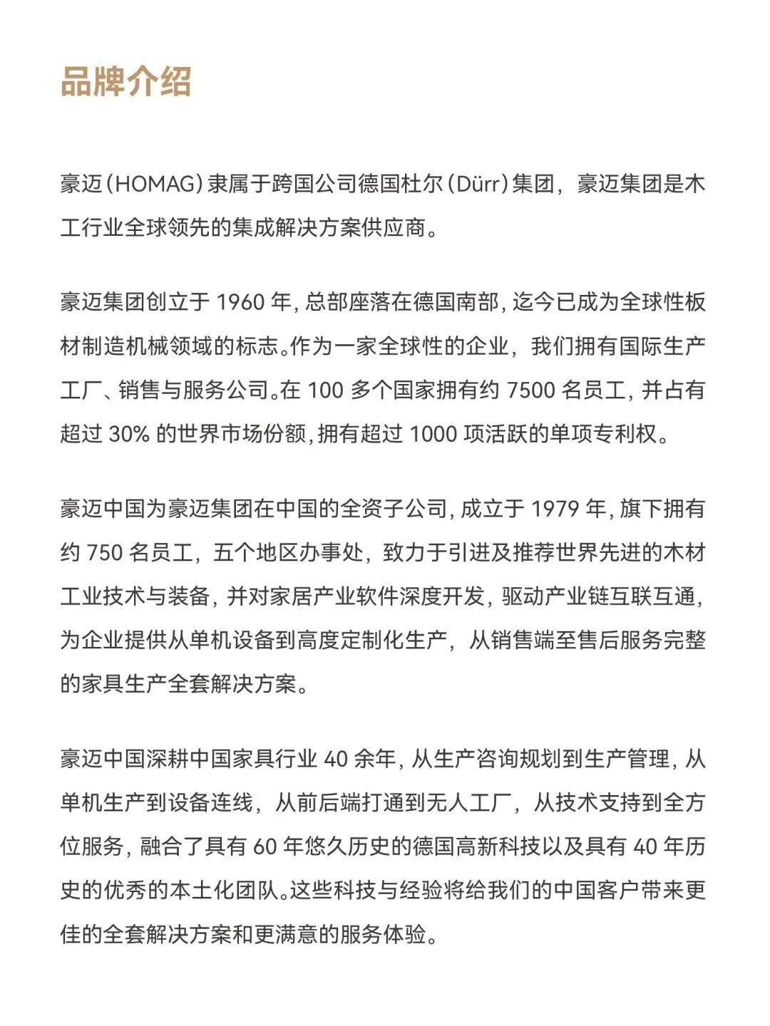 豪迈(HOMAG)隶属于跨国公司德国杜尔(Dürr)集团,豪迈集团是木工行业全球领先的集成解决方案供应商。豪迈集团创立于1960年,总部座落在德国南部,迄今已成为全球性板材制造机械领域的标志。作为一家全球性的企业,我们拥有国际生产工厂、销售与服务公司。在 100 多个国家拥有约 7500 名员工,并占有超过 30% 的世界市场份额,拥有超过1000项活跃的单项专利权。豪迈中国为豪迈集团在中国的全资子公司,成立于1979年,旗下拥有约750名员工,五个地区办事处,致力于引进及推荐世界先进的木材工业技术与装备,并对家居产业软件深度开发,驱动产业链互联互通,为企业提供从单机设备到高度定制化生产,从销售端至售后服务完整的家具生产全套解决方案。豪迈中国深耕中国家具行业40余年,从生产咨询规划到生产管理,从单机生产到设备连线,从前后端打通到无人工厂,从技术支持到全方位服务,融合了具有60年悠久历史的德国高新科技以及具有40年历史的优秀的本土化团队。这些科技与经验将给我们的中国客户带来更佳的全套解决方案和更满意的服务体验。豪迈中国始终秉承以人为本,践行“让客户满意,让员工满意,让合作伙伴满意”的服务理念,不断创新改善,强化内部管理,以诚待人,永远想客户所想,把客户每一笔的投资都视作自己的投资去经营。未来,豪迈中国将继续以德国先进的技术做依托,深耕中国市场,应用本土化策略,加强设计、研发、销售、服务的升级与调整,为中国消费者提供更多优质的全套解决方案,为客户创造更大的价值并推动中国定制家具行业的发展。 HOMAG CHINA 豪迈中国 展位号:7.1D41 WMF 2023 国际木工展 & 中国(上海)国际家具博览会 2023年9月5-8日 上海虹桥·国家会展中心