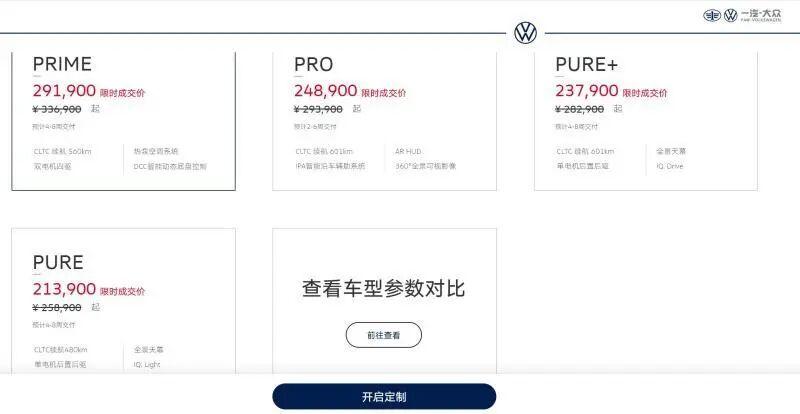 根据此前的消息来看,大众ID.3、 ID.4降价之后都取得了非常好的成绩。近日一汽大众ID.4 CROZZ推出优惠活动,新车售价低至14.59万起。作为对比,该车的厂商指导价为19.39-29.39万元,降价后的ID.4 CROZZ性价比大增。降价后的价格已经与部分中国品牌同级车看齐。7月份,大众为ID.3放出了3.7万元的优惠,售价12.59万元起,这直接提升了上汽大众的新能源车在7、8月的销量。上汽大众表示,ID.3单月销量连续破万,ID.3的热销同步带动了ID.4 X和ID.6 X的终端人气和销量。