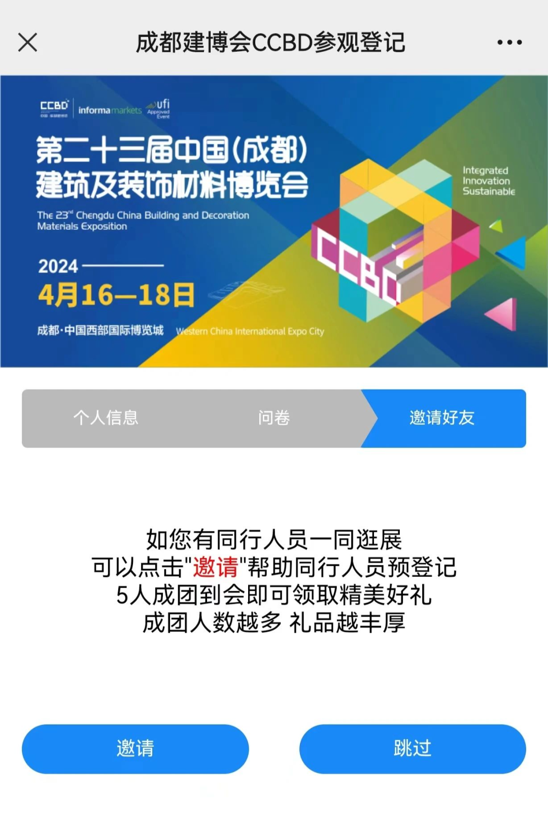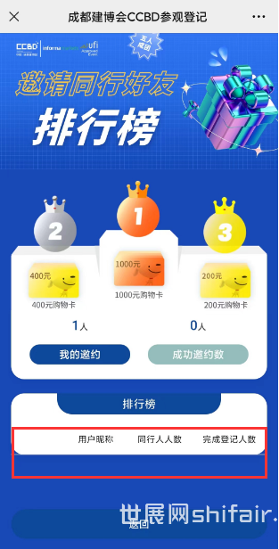 1) 本次活动奖励仅限通过本活动页添加同行好友并完成登记的或通过分享邀约海报成功登记的用户才能获得,若好友之前已通过其他渠道完成登记则无法领取奖励,可参与本活动再次进行邀请即可获得,若当用户邀约的完成登记人数相同时,则将根据邀约且实际到场人数高的一方发放最终奖励。2) 若发现用户存在异常风险,包括但不限于异常邀请、网络攻击、外挂插件、数据泄露、刷单刷票等违规行为主办方有权判断该用户的邀请无效,有权取消该用户获得的相关奖励。3) 本活动最终解释权归英富曼天一展览(成都)有限公司所有,如您对活动有任何疑问,可添加中国成都建博会小助手微信: 073进行咨询。