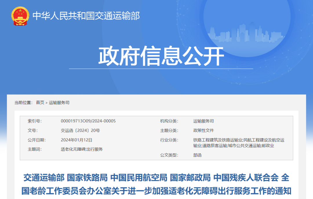 近日,交通运输部会同国家铁路局、中国民用航空局、国家邮政局、中国残疾人联合会、全国老龄工作委员会办公室等6部门和单位印发了《关于进一步加强适老化无障碍出行服务工作的通知》(交运函〔2024〕20号,以下简称《通知》),就贯彻落实《无障碍环境建设法》,进一步加强适老化无障碍出行服务进行工作部署。