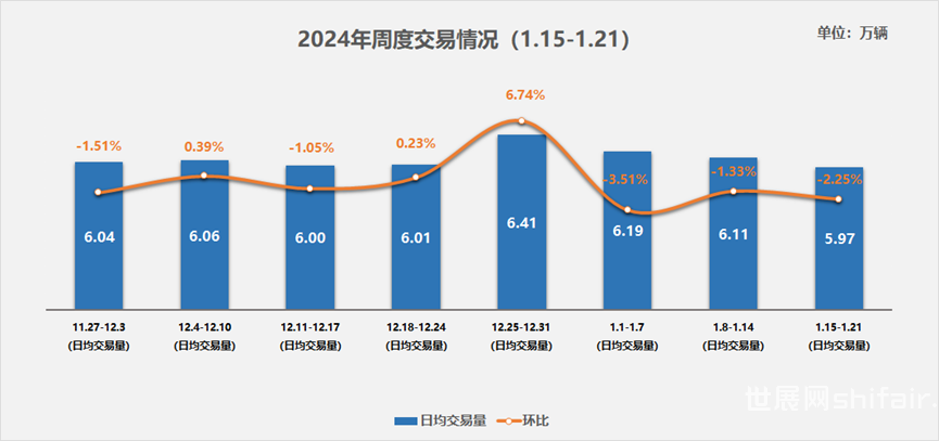 从各区域的交易情况来看,本周六大区中,东北、西北地区较上周有所增长,其余地区本周均有所下降。具体来看,华东地区本周出现小幅下降,日均交易量1.66万辆,环比下降1.5%,从重点城市上看,厦门、南通、南昌、济宁、上海本周均有所下降,南昌本周市场下降明显,环比降幅接近15%。上海上周市场回升明显,客流和成交均有明显回升,本周市场出现小幅调整,环比下降了7%。济宁、济南、温州、金华几个城市本周市场持续回暖,日均交易量较上周均有小幅增长。其他地区本周市场波动较小,整体变化不大。西南地区本周继续保持小幅下降趋势,日均交易量1.22万辆,环比下降2.6%,降幅较上周略有收窄。本周成都、绵阳、昆明、重庆等几个主要城市均有所下降。昆明、成都降幅较为明显,降幅接近10%。西藏本周市场需求有所回升,拉萨较上周增长了5%。东北地区日均交易量0.21万辆,环比增长1.4%。近两周长春市场整体有所回暖,日均交易量有所回升。锦州本周小幅下降了1个点,降幅进一步有所收窄,大连、哈尔滨等地本周市场较为平稳。中南地区日均交易量2.52万辆,环比上周下降3.1%。从重点城市来看,南宁、海口、焦作、武汉、长沙几个重点城市本周均出现较为明显的下降,武汉、长沙降幅超过10%。广州、东莞本周市场有所回升,东莞市场较为活跃,环比上周增长了11%,广州较上周增长了6%。中南是二手车交易的重点地区,近几周市场整体需求有所减少,日均交易量连续三周呈现下降趋势,后期可以重点关注。华北地区本周日均交易量0.26万辆,环比下降2.3%。北京、天津本周依然是下降趋势,降幅较上周有所收窄,赤峰下降较为明显,降幅超过了10%。石家庄、廊坊、太原本周表现较好,尤其是廊坊和太原本周增速均超过了10%。西北地区日均交易量0.10万辆,环比增长5.5%。从重点城市来看,本周西安、兰州、西宁市场表现较好,尤其是西宁环比增速超过30%,其余地区整体变化并不明显。综合来看,2024年前三周,日均交易量呈现逐月下降趋势,但是仍好于上月的同期水平。按可比口径计算,2024年1月1日-21日,二手车交易量120万辆,较2023年12月同期增长1.2%,预计2024年1月二手车交易量在163万辆左右。