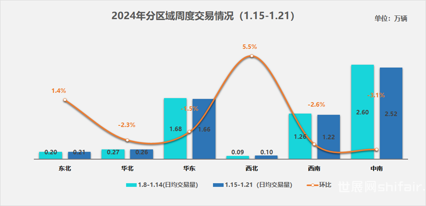 注:交易量按5个工作日计算2024年的第三周,二手车市场日均交易量5.97万辆,环比上一周交易量下降2.25%。元旦假期的消费需求在本月前两周体现比较明显,到店客流量明显增加,经销商清库存力度加大,因此第三周市场交易量下滑也属于正常的市场波动。每年临近春节大部分车商会选择提前回家过年,因此对1月份后两周的交易量也会有一定影响。但今年1月份有22个工作日,相对2023年1月份多了4天,春节节前消费时间长,拉动市场增量会更充分。按可比口径计算,2024年1月1日-21日,二手车交易量120万辆,较2023年12月同期增长1.2%,预计2024年1月二手车交易量在163万辆左右。本周的调研结果显示,41%的经销商表示市场客流量较上周有所下降,占比较上周增长了10%。同时有25%的企业表示经营状况不好,50%的企业表示交易量与上周基本持平。2023年,汽车交易市场中不乏中小车商退租转行,但与此同时,经销商集团和一些有实力的二手车独立经销商则加大了对二手车业务的布局力度。2024年二手车市场的竞争将更加激烈,各大二手车商将会加大营销力度、提高服务质量和客户满意度来提升自身的市场竞争力和市场份额。1月二手车市场区域周度分析