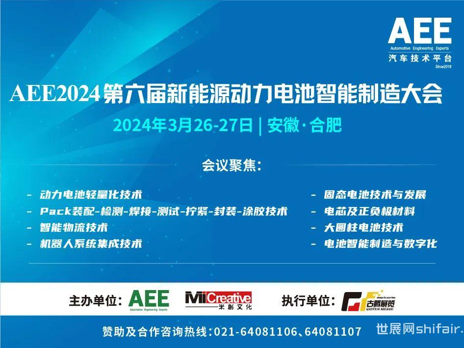 由AEE汽车技术平台主办的AEE2024第六届新能源动力电池智能制造大会将于3月26-27日在合肥举办,会议旨在探讨固态电池技术、大圆柱电池、电芯、材料、电池智能制造与数字化、动力电池轻量化、电池Pack装配-检测-焊接-测试-拧紧-封装-涂胶技术、智能物流技术、机器人系统集成技术,来自整车、电池、电芯、材料、工艺领域专家将齐聚合肥参加本届盛会。