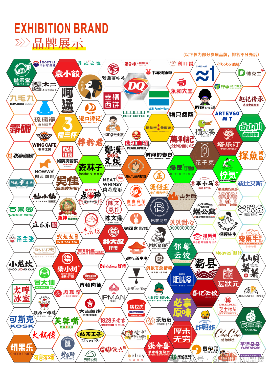 益禾堂、袁记云饺、九毛九集团(太二酸菜鱼、山的山外面贵州酸汤火锅)、邮局咖啡、书亦烧仙草、茅台冰淇淋、张亮麻辣烫、小龙坎、柠季、阿婆牛杂、广州酒家利口福、巴黎贝甜、袁小饺、珠江啤酒、拌粉君、缇里、柠気、聂记云饺、第九味、探鱼、卤山川、啊T奶茶、港口谭记、挪瓦咖啡、茶理宜世、贝贝甜心、斯味洛、仙小仙、霸碗盖码饭、赵记传承、太哼冰室、点蹄、朴大叔、煲仔正、森林子、OK便利店、麻爪爪、波妹、虎头炸、永和大王等.....众多品牌大腕云集,各通道和展位洽谈区都是人山人海,人流挤挤,让人为之震撼!