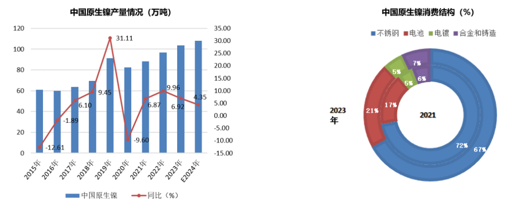 供需情况,需求端随着不锈钢价格高位回落,下游消费领域保持较好的增长态势,尤其是与其他相关产品间的替代关系保持着优势。2023年中国不锈钢材产量达到3612万吨,同比增长9.5%。表观消费量由2022年的负增长,恢复到7.2%的正增长,实际累计增幅达8%以上,即总量3153万吨。之所以产量和消费均保持较高的增幅,一方面得益于价格的高位回落,国内刚性需求得到释放;另一方面,进口量的大幅减少,出口量的小幅收缩,净出口量大增,起到了关键性作用。2023年不锈钢进口总量减少至2207万吨,同比下降37%;出口量保持在414万吨水平,降幅远远低于预期,降幅仅为9%;净出口量将增加到207万吨,增幅达63%。 展望2024年,宏观面或将呈现触底逐步回升,利率方面以美国为首的主要经济体将进入降息周期,2024年通胀或将再起,将引领全球大宗商品价格同比上涨。中国不锈钢及原料市场将是需求导向的一年,价格波动幅度将收窄,年度均价格中枢相比2023年将下移,但是单边下跌的情况将一去不复返。不锈钢及原料供应整体过剩的局面依旧存在,不锈钢新增产能有限,供需矛盾所带来的压力或将略有缓和。一、全球镍系产品全面进入过剩格局 2023年,全球镍系产品新增产能的集中释放期,而需求端陷入阶段性停滞状态,尤其是新能源动力电池行业,对于硫酸镍的需求放缓明显。同时,用镍铁生产高冰镍;高冰镍生产硫酸镍,再转产电积镍(精炼镍)技术路线的突破,给传统电解镍市场从成本和供应双方面带来新的冲击。近两年,中国原生镍产业结构中,精炼镍和硫酸镍的供应比重增长较快,印尼是主要的供应主体,进口占比达到90%以上,产品原料主要是高冰镍和MHP(氢氧化镍钴),自此全球镍市场全面进入过剩的局面。LME镍和沪镍期货价格纷纷下跌,LME镍年末最低跌到16000美元/吨,跌幅48%。沪镍最低跌到121800元/吨,跌幅46%。