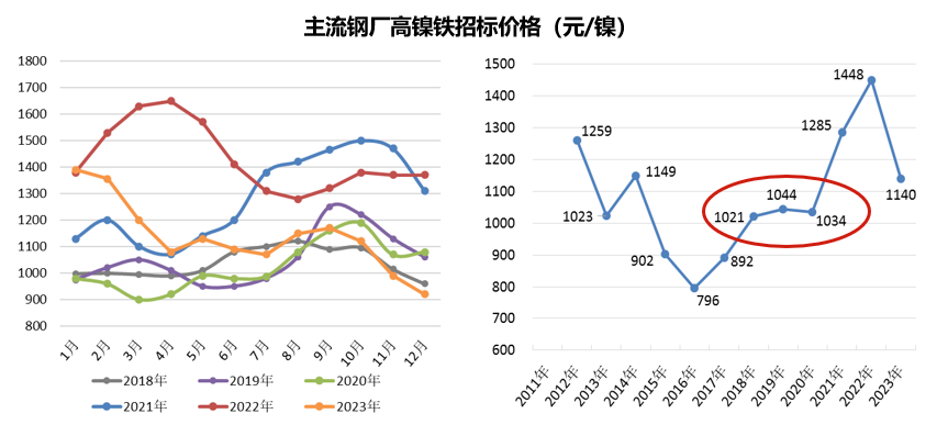 镍铁方面,2023年国内主流不锈钢厂高镍铁招标价格呈现下跌态势,价格逐步回归理性。年初价格最高到1390-1400元/镍,年末跌至900-910元/镍,全年均价在1140元/镍,较2022年下降300-310元/镍。今年价格之所以下跌,主要是印尼低成本镍铁产量的快速增加,给国内市场带来一定压力。以2023年12月为例,中国镍铁生产成本集中在1040-1050元/镍,印尼则为850元/镍上下,印尼回到国内成本最高不过900元。 过去两年,国内镍铁企业始终保持有利润状态,只有今年9月份以后出现了亏损。整体利润情况尚可,目前看2024年国内镍铁厂不至于被快速淘汰,还能继续维持一段时间。未来趋势肯定是独立高成本镍铁厂逐步退出市场,或转产其他产品。当然,在当前市场情况下,完全让国内镍铁企业长期处于亏损状态是不现实的,让有成本竞争力的企业维持盈亏平衡或微利仍是主流,因此判断2024年上半年镍铁将略有反弹,但是全年均价或将维持在1000-1100元/镍之间,回归到2018-2020年水平。未完待续资料来源:中联金