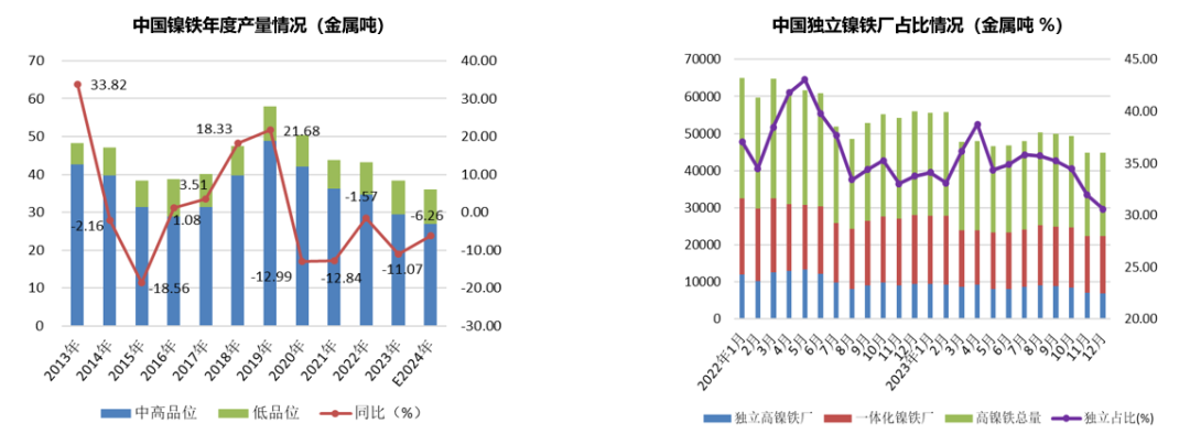 虽然镍矿进口量保持增长,但是由于品位的下降,实际进口镍的金属量在减少。今年镍矿进口增量主要体现在0.3%以下的低镍低铝高铁的矿种,主要应用于普碳钢厂,今年增量约翻一倍。那今年国内镍铁产量继续呈现下降态势,据中联金统计,2023年中国镍铁产量为38.4万吨(金属量),同比减少4.8万吨,降幅11.1%。预计2024年总产量将进一步被压缩,至35-36万吨,降幅6%上下。主要是压减独立镍铁厂份额。目前国内镍铁总产量中,低镍铁份额占比在24%,高镍铁占比76%。低镍铁基本全部为一体化钢厂所生产,单月产量在9万吨。高镍铁中,一体化占比在65%,单月在1.5-1.8万吨之间;独立镍铁厂占比在35%,单月在0.85-0.9万吨之间。