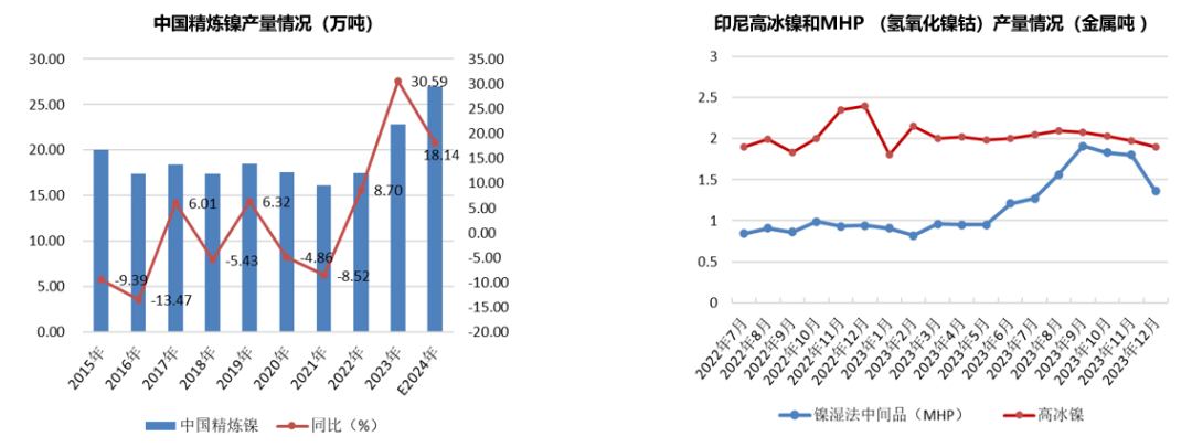 支撑中国精炼镍产量同比增加的高冰镍和MHP(氢氧化镍钴中间品)环节。印尼高冰镍和MHP产量均出现了明显的增量。据中联金统计,2023年印尼MHP月均产量约1.3万吨,总产量在15.53万吨(金属量)。高冰镍月均产量约2.1万吨,总产量在24.08万吨(金属量)。二者基本90%以上全部回国使用。另外,2023年二者新项目继续投建中,2024年预计产量将再增加,但是由于价格的大幅回落,会影响投产速度,尤其是高冰镍相比于MHP成本高,高冰镍的新项目将放缓,致使精炼镍产量增幅下降。