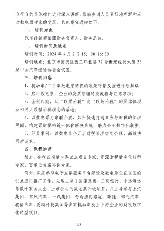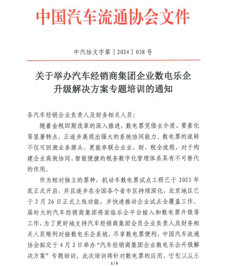 各汽车经销企业负责人及财务相关人员:随着金税四期改革的深入推进,数电票凭借去介质、要素化等显著特点,正逐步展现出强大的系统协同能力。数电票的流转不仅可回溯业务源头,更能串联企业业、财、税全流程,对于构建企业高效协同、智能便捷的税务数字化管理体系具有不可替代的作用。作为相对独立的票种,机动车数电票试点工程已于2023年底正式开启,并且逐步在全国各个省市区持续深化,北京地区已于2月26日正式上线功能,并快速推动企业试点全覆盖工作。届时大的汽车经销商集团将面临乐企平台接入和数电票升级等工作,为了更好地支持汽车经销商集团会员企业负责人及财务相关人员顺利对接数电乐企系统,尽享数电票便利,中国汽车流通协会拟定于4月2日举办“汽车经销商集团企业数电乐企升级解决方案”专题培训。此次培训将针对数电票的应用、管理以及乐企平台的具体操作进行深入讲解,帮助参训人员更好地理解和应对数电票带来的变革。具体事宜通知如下: