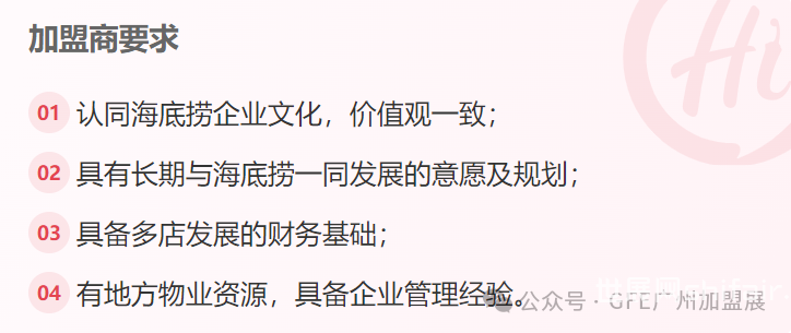 海底捞的加盟商有两个定位:一个是资本加盟;一个是知识加盟。加盟的要求,其中之一是“有地方物业资源”,直接理解是地产,但里面还包含另外一层意思,拥有当地的“知识资源”——就是对当地市场的深度了解。比如在当地市场扎根很深的地方企业,能够节省很多深度了解当地市场的获取成本。