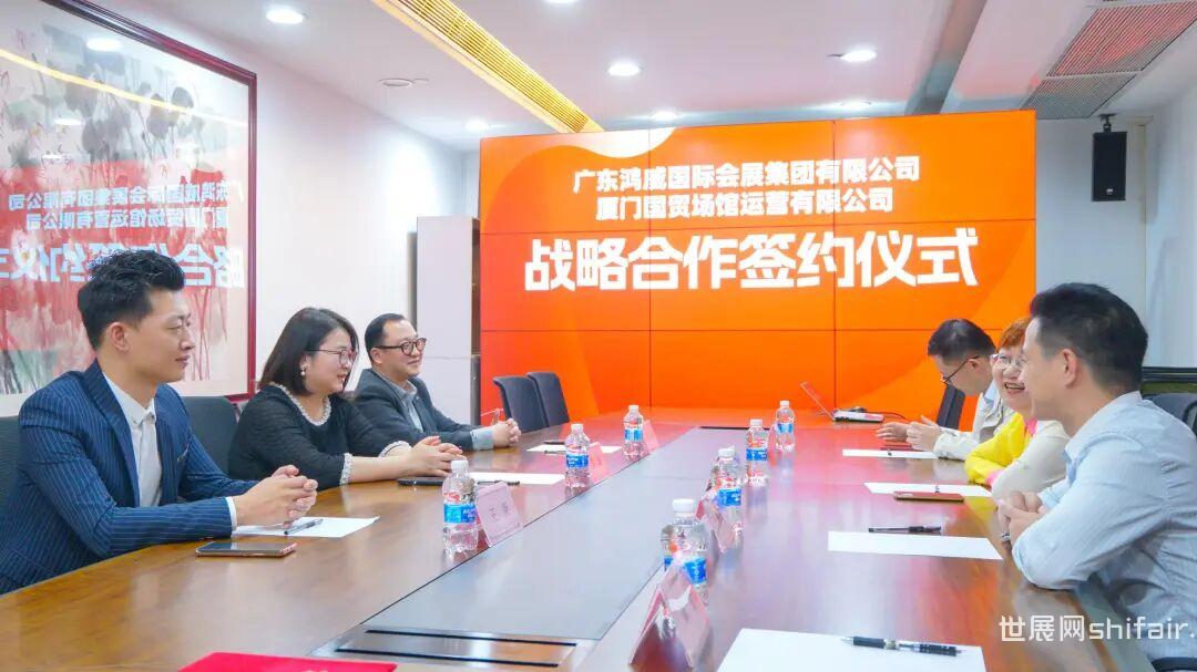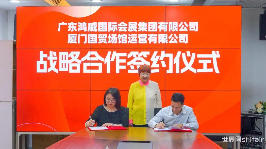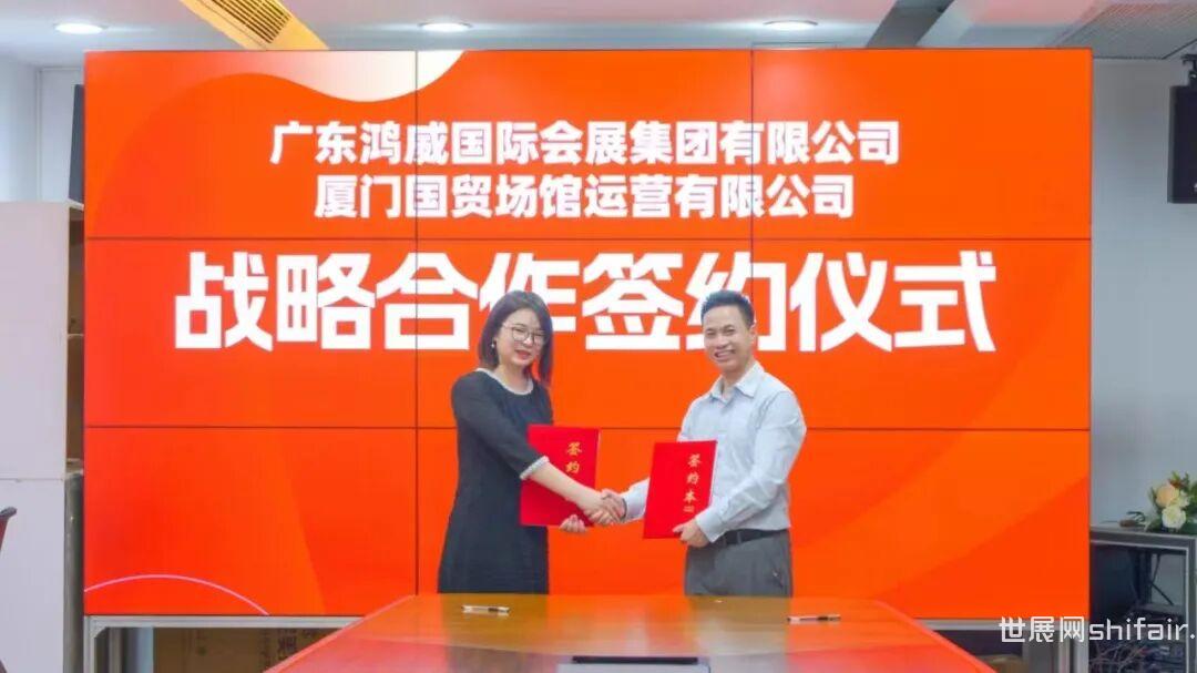 广东鸿威国际会展集团有限公司董事总裁王登云与厦门国贸场馆运营有限公司总经理苏琦进行签约。